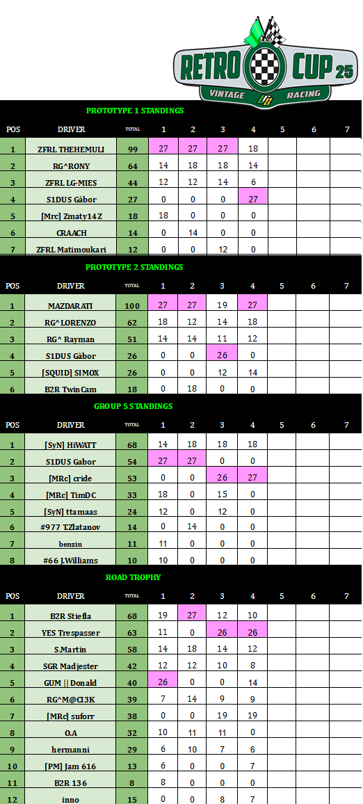Here it is a look at the class standings after 3 events: in the Prototypes 1, ZFRL Thehemuli is extending his lead over the rest of the competition, but RG^RONY have shown big signs of speed in Blackwood, fighting for the lead of the race.