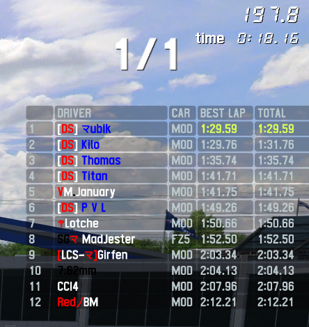 On the [DS] Driver Seat Events server (running on 0.7F), all results with car mods are shown as MOD despite the fact that it has been replaced by the four-character mod names in 0.7E.
