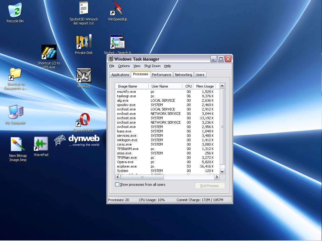Yes, don't look at the tab marked "Applications" but the tab marked "Processes". A friend of mine was looking at his dad's new computer just the other day. He said it had 68 processes running in the background :jawdrop: . Said under the performance tab, CPU Usage and PF Usage was showing around 80% at idle. Of course that was a shelf bought system, probably Dell, Compaq, or HP. I had days worth of figuring out all the processes and disabling them when I had Compaq. Really, freaking Windows programming allowing others to access your PC remotely was default to ENABLED!!!!!! Freakin lunacy.