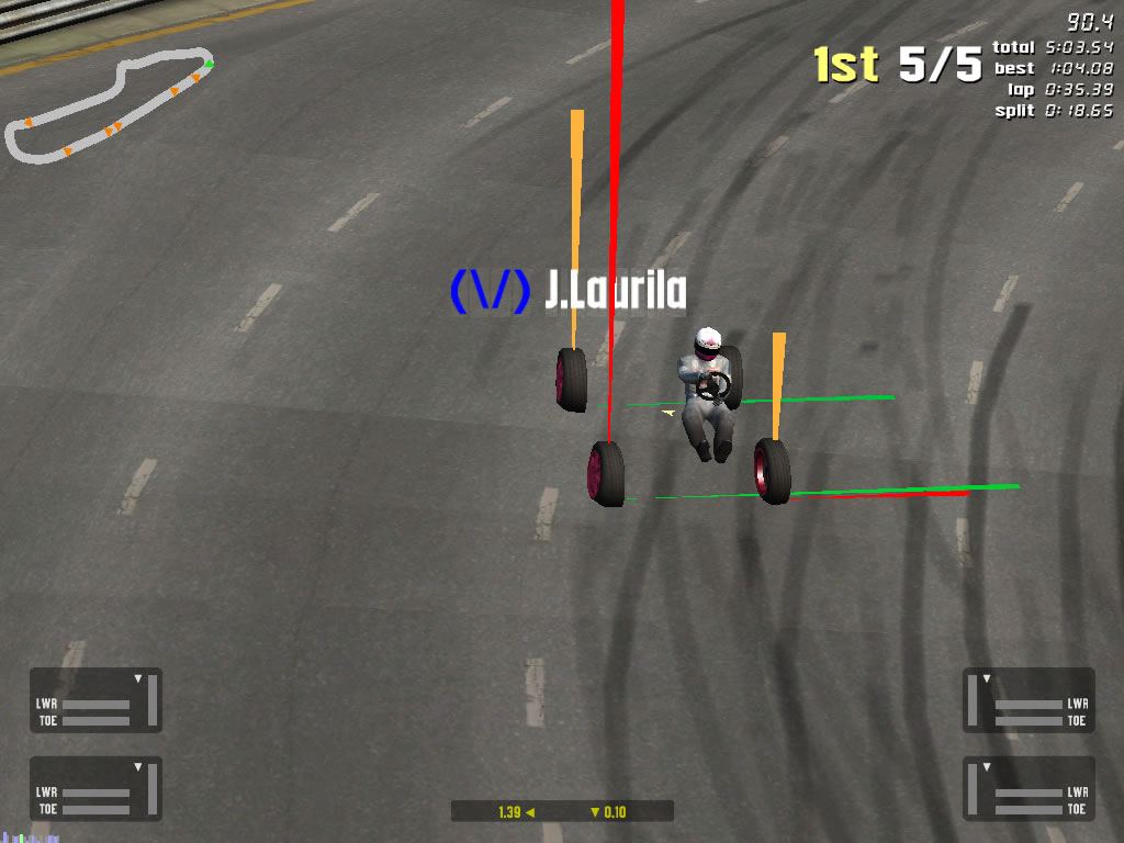 Here I have an example of my teammate Jonesy tapping the wall on South City, and there is no visible damage on the car or even the damage bars, yet it looks like he broke his right front linkage completely. The forces view even proves this. The replay at lap 4 or so should show his car bouncing around. I asked Jonesy and he never even had any damage at all, and this is what I've usually seen when the damage is never "True", and just visual. Probably something to do with lag, but I have seen this a lot. BF1 is a perfect example, where someone might tap a wall and not get any damage, but all of a sudden their car will start bouncing around up and down wildly, but still be driving at a fast pace. Looks really bad. And like when people have their camber slammed to the side, they could be driving and the tire would look like it is dragging, causing a big skidmark wherever the car drives, and tons of smokes coming out the back.