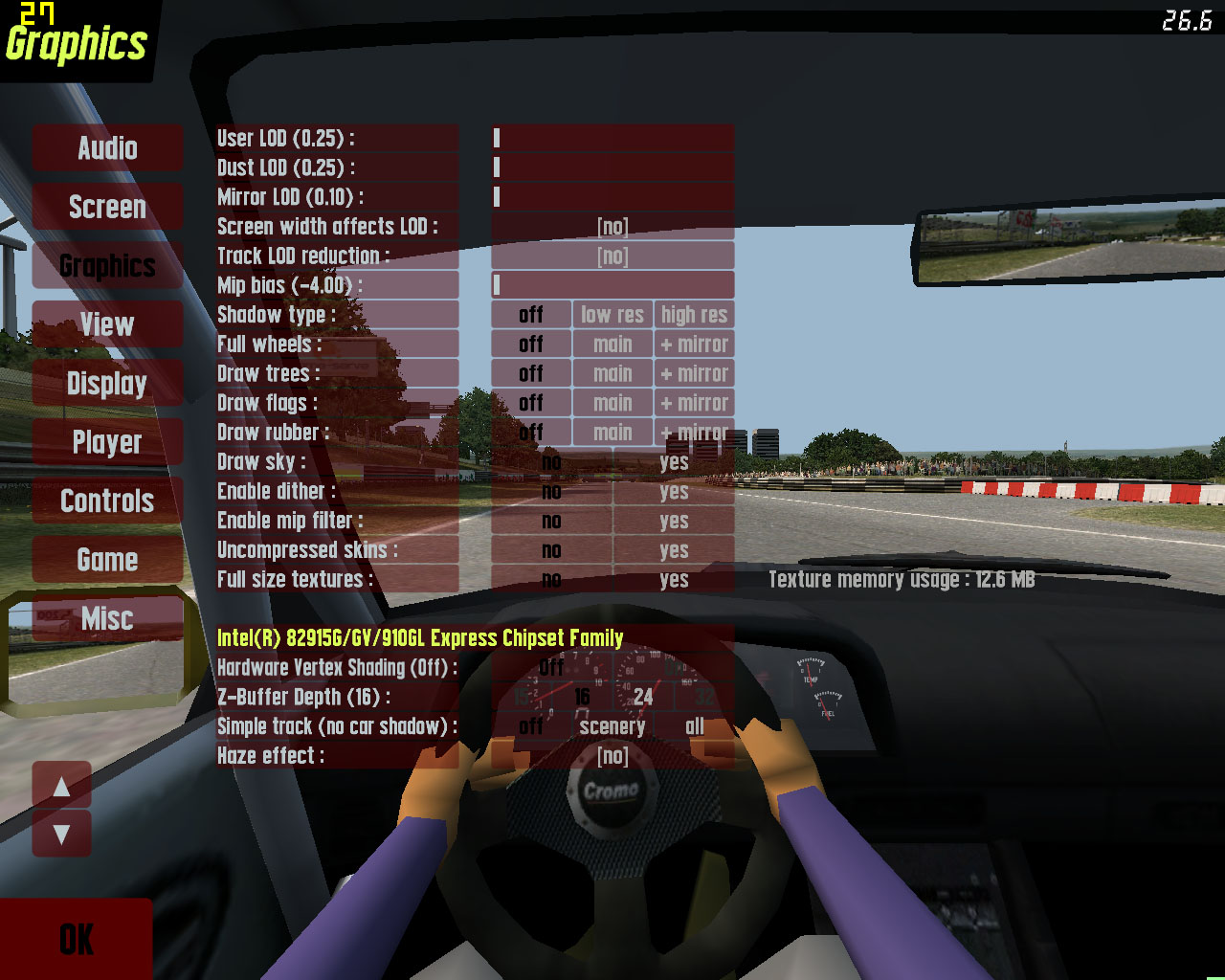 When I first bought my PC (last spring) I ran the unofficial LFS benchmark, which is basically a standard single player replay which you run with Fraps running. Fraps will record average, min, and max framerate during the replay. I had turned on and off or high and low, every single option available in LFS and recorded the framerate stats with Fraps. Nothing I changed did a thing to frame rate running at 1024x768 on my onboard graphics.