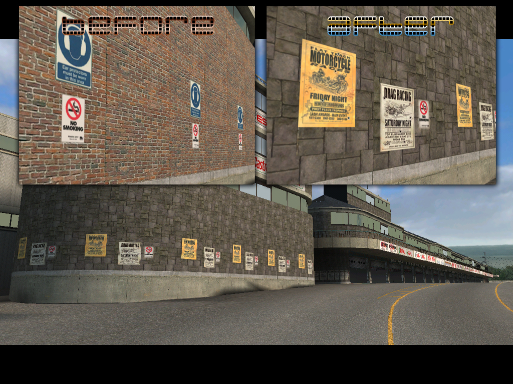When I think "pit wall on a race track", I don't think "plastered with ads for uninteresting events"...