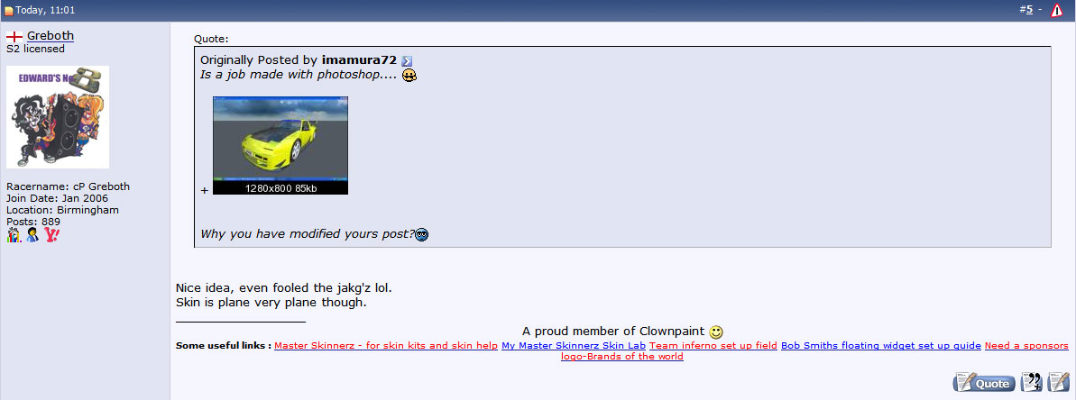 Quote from Jakg :hmmm... i see you edited your post... (Greboth, i mean!) And yes, i DO believe him - look at the pic, no driver! EDIT - Greboths original post, attached. You can never beat me! Its the damn avatar, i keep thinking its you posting when its not lol. Quote from keltern :ehmm.. even though it might not be too hard to make a xrr in ps, i don't believe this one.. demo racer.. hah! Put both picture in photoshop or such and hide/unhide one layer can see so obvious its the same pic Quote from Jakg :Ok then - how is it the car has no driver? And theres no tyre deformation? It was a silly thing to do BUT its quite convincing! No driver option an the tyres do deform in cmx viewer just looks front on at the bottom of the tyres.