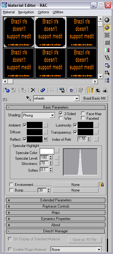 well for one, i suggest you press F10 and change the production renderer to scanline (Default)[its at the very bottom of common tab] so you can see the materials you are working with (and then go back to brazil for the rendering if you want)