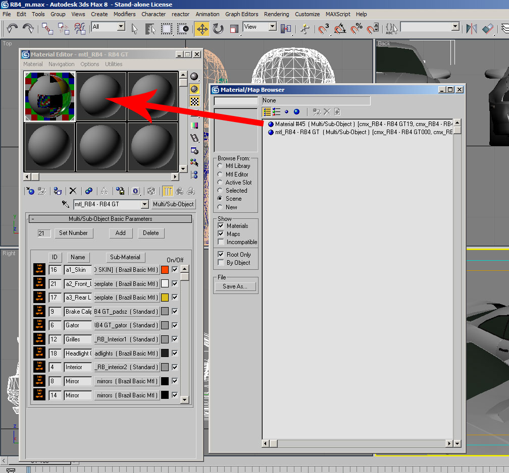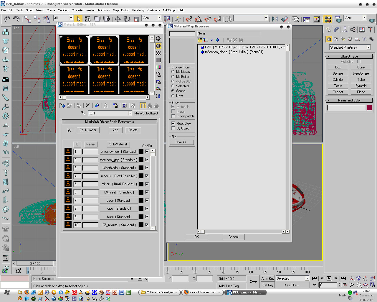 I wanted to make a scene with two FZRs in it. I've downloaded the Scene from DS-Autos. I copied the Car. (Selected, Strg+C, Strg+V) And moved it to a free position. My problem now is how to apply different skins. I have copied the Material which includes the skin and put my skins on it. So I have two Skin Materials with 2 different skins. I've selected the faces of the body of the one car (the parts including the skin). But when I applied another Material ID to this part (for the second skin) the skin of the other car is changing too.