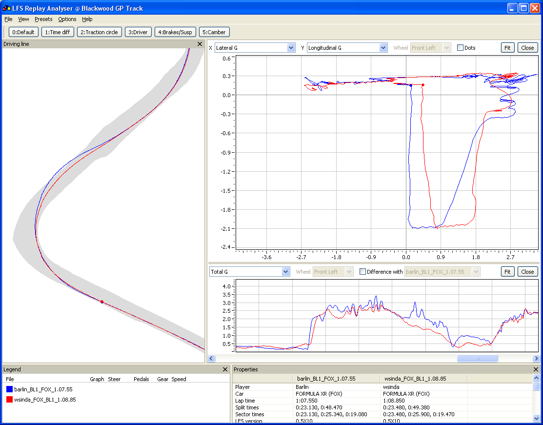 LFS Replay Analyser (LRA) is a tool for analysing telemetry files from the Live For Speed racing simulator. It can help you to analyse your driving and your setup, and to compare your own laps with those of others. LRA can display all kinds of telemetry data, in several types of graph.