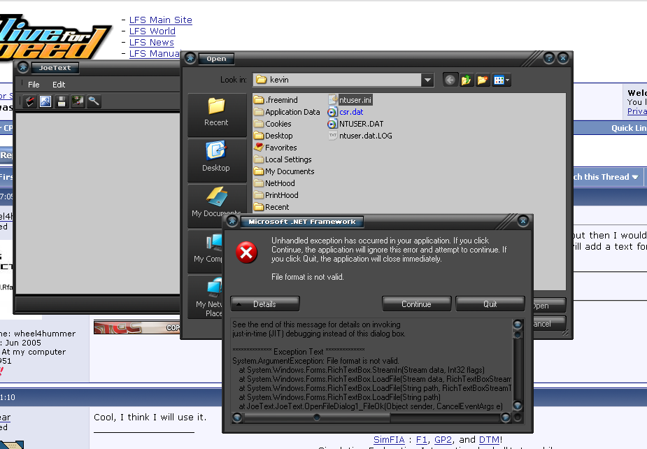 Thanks for posting that! My program only can open .rtf files at the moment. Only problem is, I forgot to make it check the extension. I will put that in today.