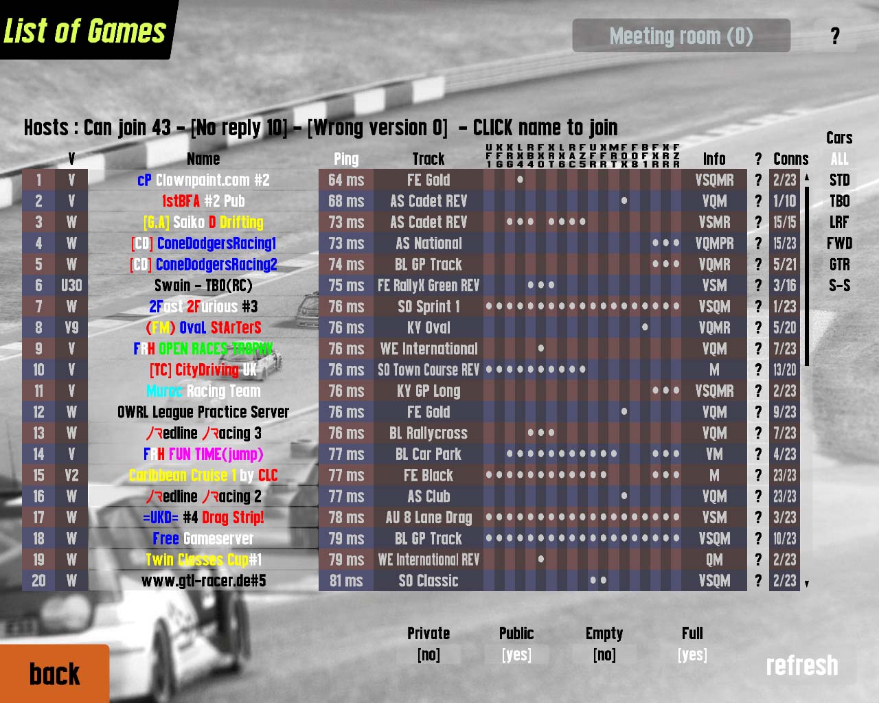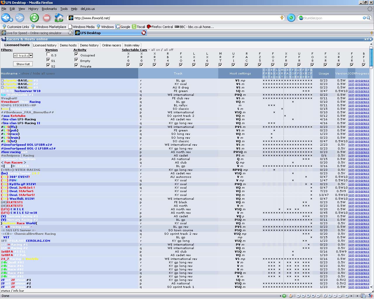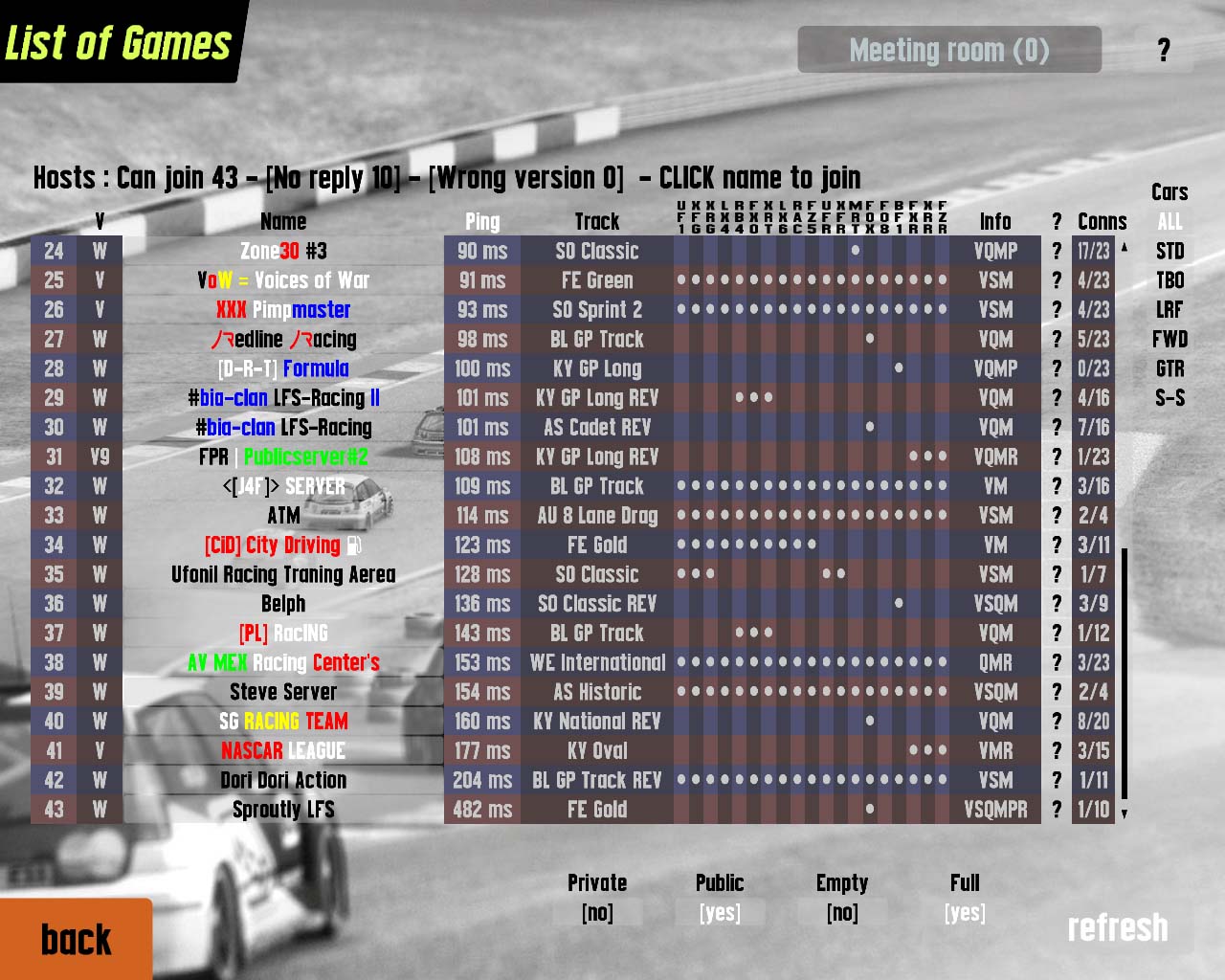 Celtic in your screenshots you have empty and private servers filtered out so they don't show up when you refresh lol That's why the list is smaller compared to lfsworld. There's only about 50 servers that are populated even though there are hundreds of servers. The XFR server runs on port 27005 and it's not on your list because it's usually empty and it should be on the list of ports not blocked.