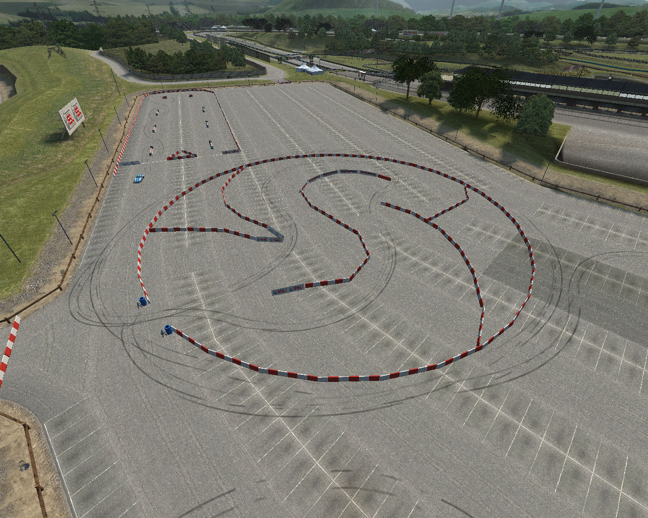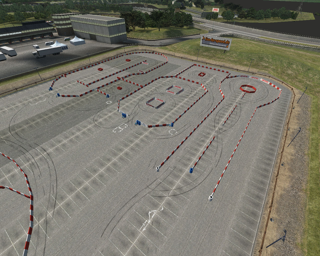 This is my first layout for Live for Speed and I must say I'm kind of proud of it! This is a technical drifting area with multiple courses, mostly tight ones, good for practicing show drifts... You can drift around the big circle in the middle to practice fast, long turns and inside the circle, you have a small course to practice small, tight turns. Also, there is a twin "drift/drag" layout : you basically drift between the obstacles, make a u-turn and come back still while drifting. Well, just look at the pics and tell me what you think... Tell me if you like me to add something else in the unused part and I'll do my best! Thanks!