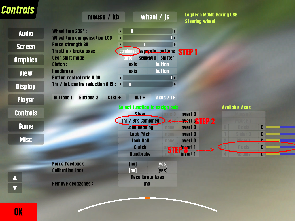 3. When the "Available Axis" show up, press Y axis and when you push down the gas, the yellow should go to the left and when you apply the brake, the yellow should go to the right