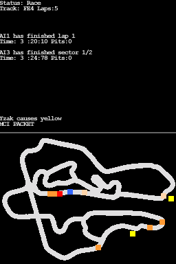 If you have seen one race the colours as self-explanatory. (red=leader, orange=player not yet lapped by leader, light orange=lapped player, yellow=yellow flag, blue=blue flag, lila/pink=pit lane)