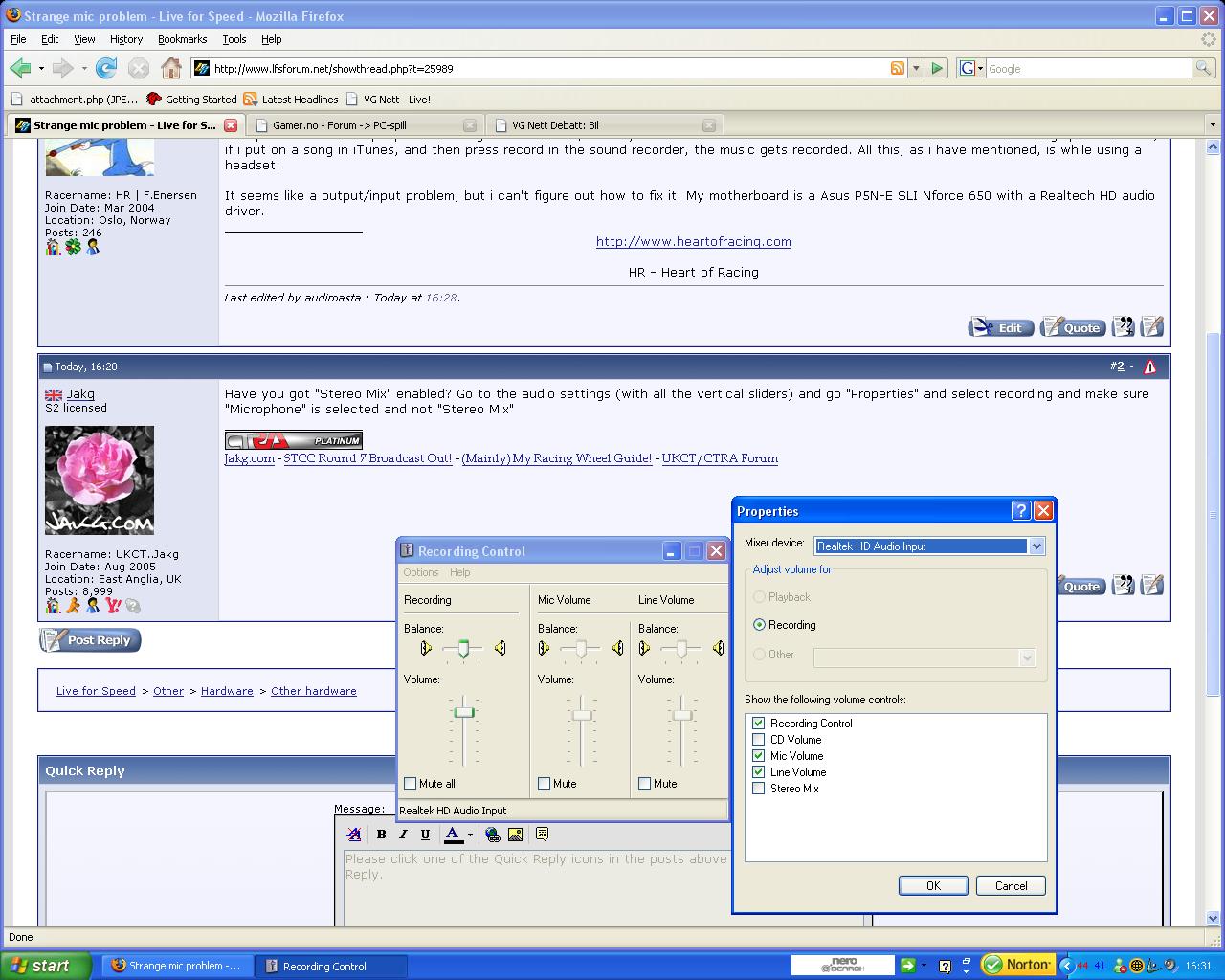 It seems like a output/input problem, but i can't figure out how to fix it. My motherboard is a Asus P5N-E SLI Nforce 650 with a Realtech HD audio driver.