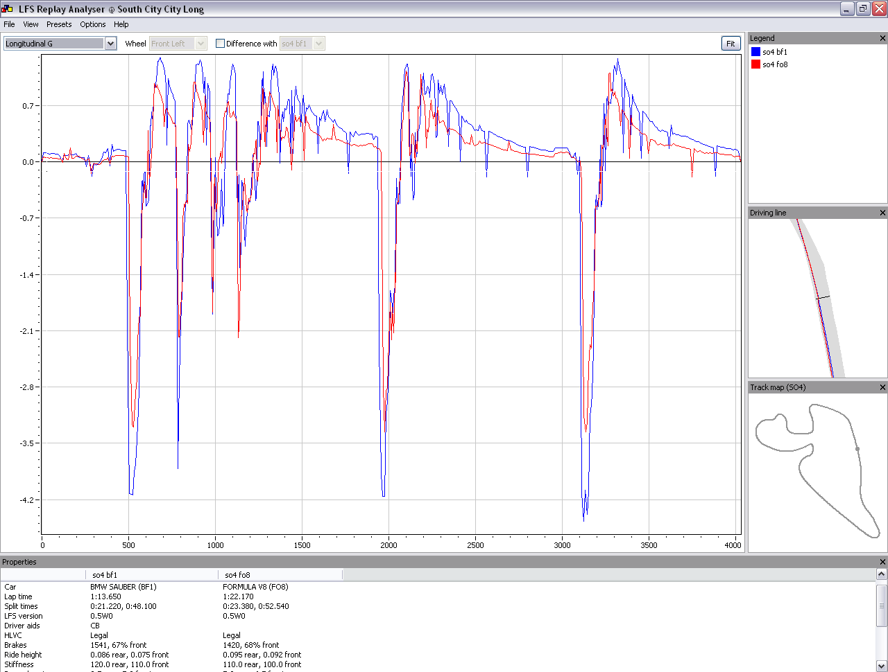 And seeing that the bf1 pulls up to 1g more than the fo8, yet both have the same cornering speed, would imho point to the fact that the line and the steering inputs of the fo8 must be smoother. Which in turn means, that the bf1 could be driven faster through the turns, at least theoretically. Correct?