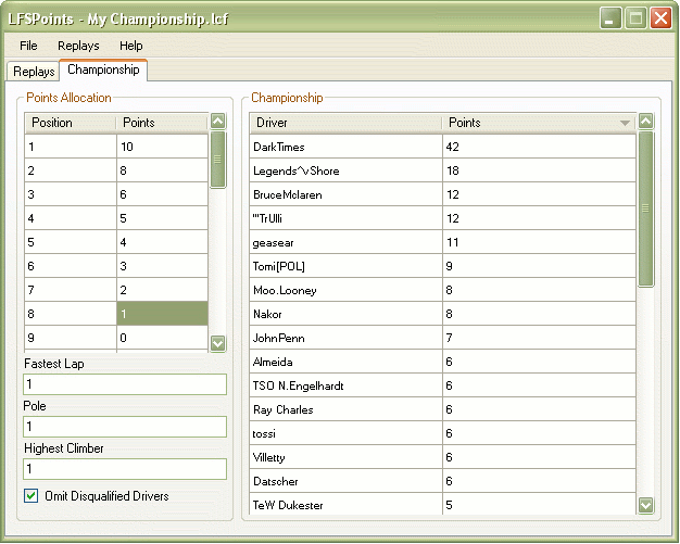 LFSPoints is a small program designed to aid league managers in calculating the championship point results for races in the racing simulator Live for Speed. It works by parsing the Multiplayer Replay files (.mpr) created by the game and comparing the results against a user-defined points table. It then gives a display of the results which can either be copied and pasted, or exported as an XML, HTML, CSV or UBB file.