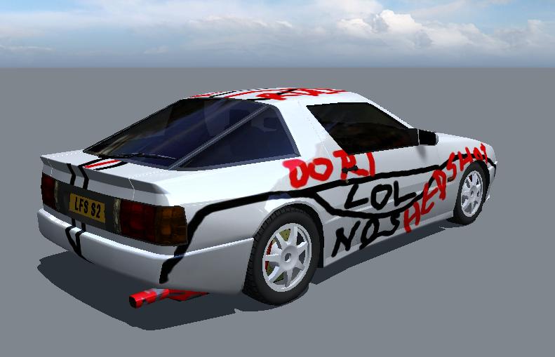 Agree with garph on that, faster, when you have the experience you have of LFS and you make a skin like that, its probably the lowest level you can get as a skinner (experienced LFS user, shite skin) sorry but its true. Personally, when I made my first skin which was AGES ago, it was extremely basic (FZR Default skin with the Porsche logo on the bonnet and 2 sides