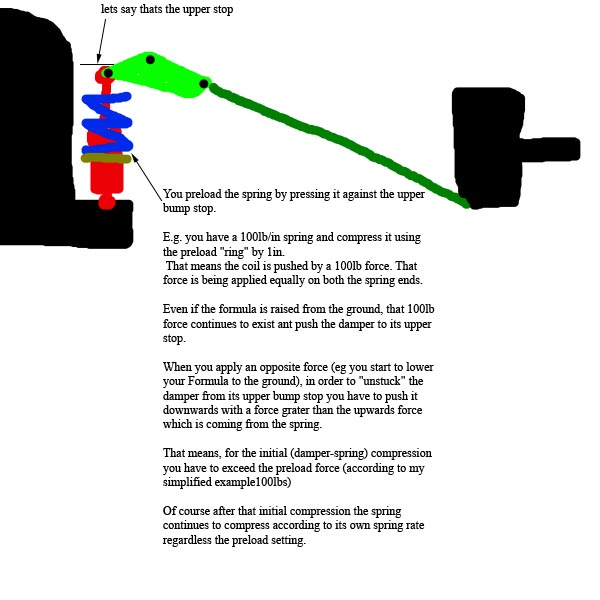 What I came up with when thinking about preload is that an easier way to think of it is simply as a travel limiter instead of some kind of magic extra force. Applying preload is simply the exact opposite to a bump stop. A bump stop limits how far a spring can travel in bump direction and adding preload limits how far a spring can travel in the droop direction.