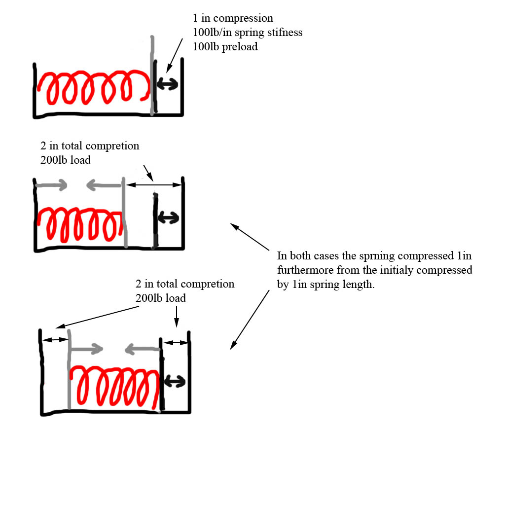 You see, I believed that the preload compresses the spring 1 inch (100lbs force). Adding a further 80lbs will then compress it 0.8 inches MORE (1.8 total compression), and that 120lbs of extra load would be a 1.2" compression (2.2" in total). I think the preload doesn't absorb any extra load.