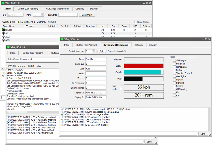 The reply port is set to the port displayed +1. Once InSim is enabled, make sure the IP is "127.0.0.1" (for local connections), your admin password is in there if applicable and hit connect. All output should be stuck in the "console area" below. Once you're connected the icon will turn green and if in game, the list will populate. After connected you can set the intervals for OutSim and OutGauge as wanted and add a listener or three for the gateway. The example browser can be used at any time.