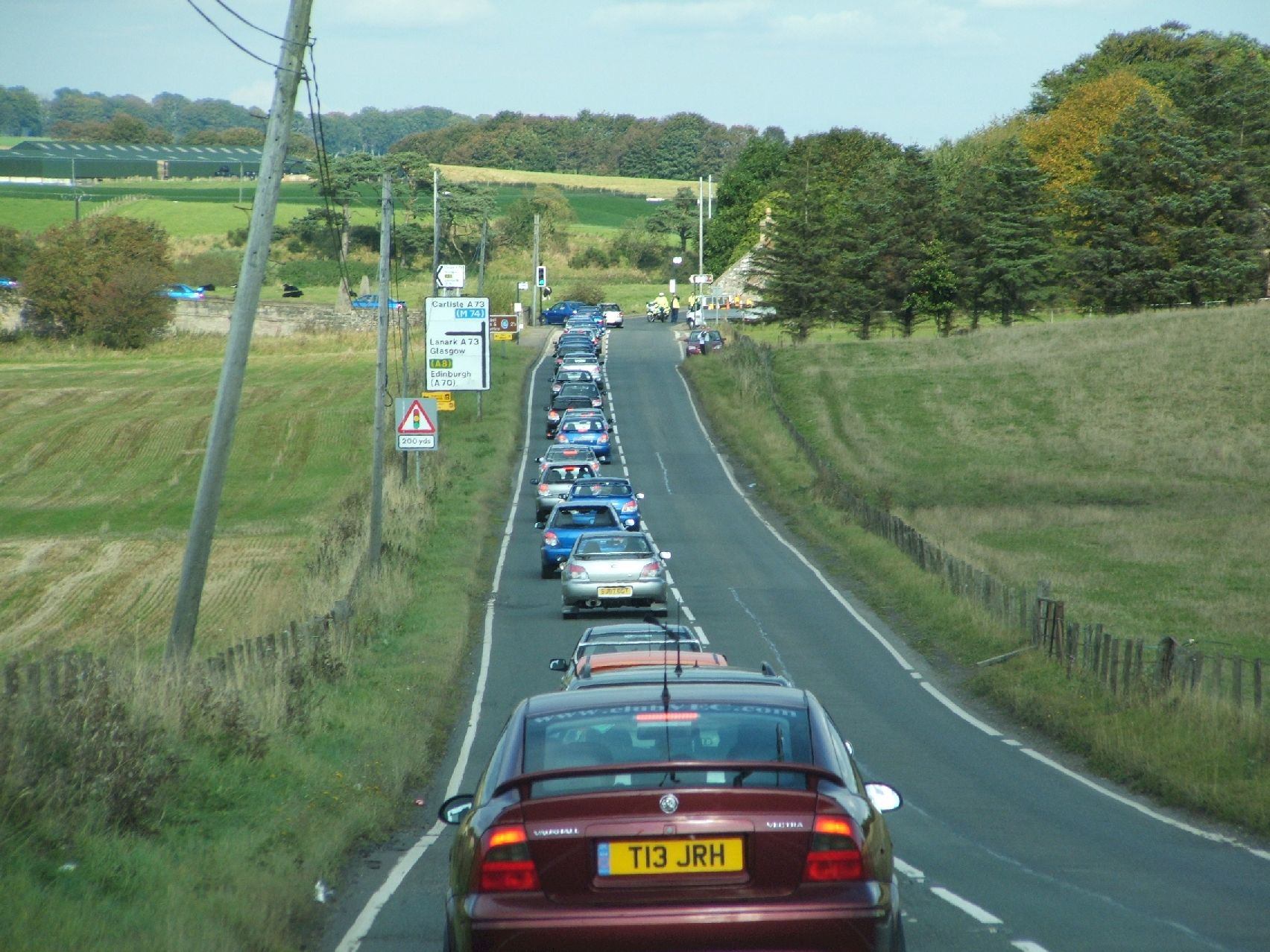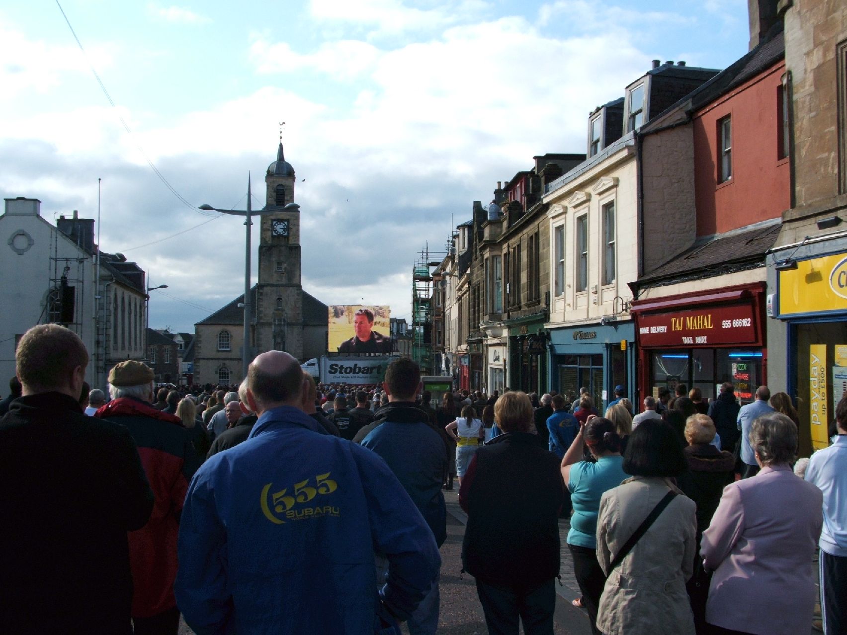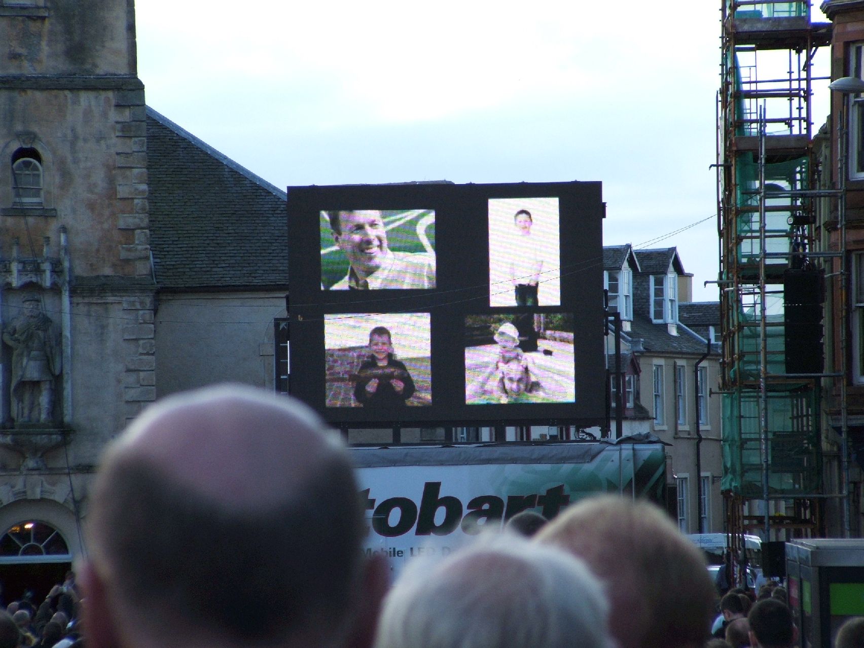 For those who didn't know there was a service of celebration for Colin and Johnny McRae held today in their home town of Lanark, in Scotland. I went along and took a few pictures (most didn't turn out very well though...). On the way there we joined on the end of a convoy of at least 50 Imprezas on the motorway and to the town. It was a really good feeling to be driving in convoy with so many fans like myself and my friends. There were free buses provided to take us from a nearby car park to the town centre and when we got there it was totally packed. I don't know how many people were there but it must have been well into the thousands. People came from all over the local area, the country and even other countries to be there. It just goes to show how much Colin meant to people around the world. There were two huge displays in the main street showing video clips of Colin and Johnny and relaying the memorial service from inside the church. Colin's manager, David Richards, Johnny's headteacher and teacher and Ari Vatanen all paid tribute during the service.