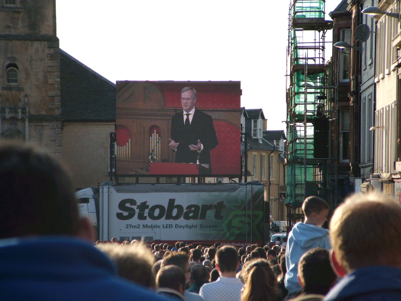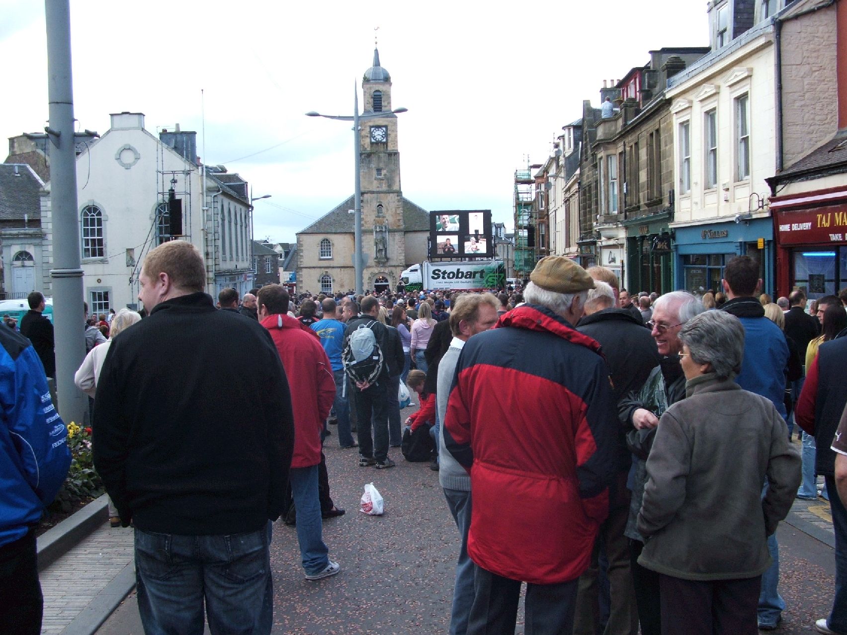 For those who didn't know there was a service of celebration for Colin and Johnny McRae held today in their home town of Lanark, in Scotland. I went along and took a few pictures (most didn't turn out very well though...). On the way there we joined on the end of a convoy of at least 50 Imprezas on the motorway and to the town. It was a really good feeling to be driving in convoy with so many fans like myself and my friends. There were free buses provided to take us from a nearby car park to the town centre and when we got there it was totally packed. I don't know how many people were there but it must have been well into the thousands. People came from all over the local area, the country and even other countries to be there. It just goes to show how much Colin meant to people around the world. There were two huge displays in the main street showing video clips of Colin and Johnny and relaying the memorial service from inside the church. Colin's manager, David Richards, Johnny's headteacher and teacher and Ari Vatanen all paid tribute during the service.