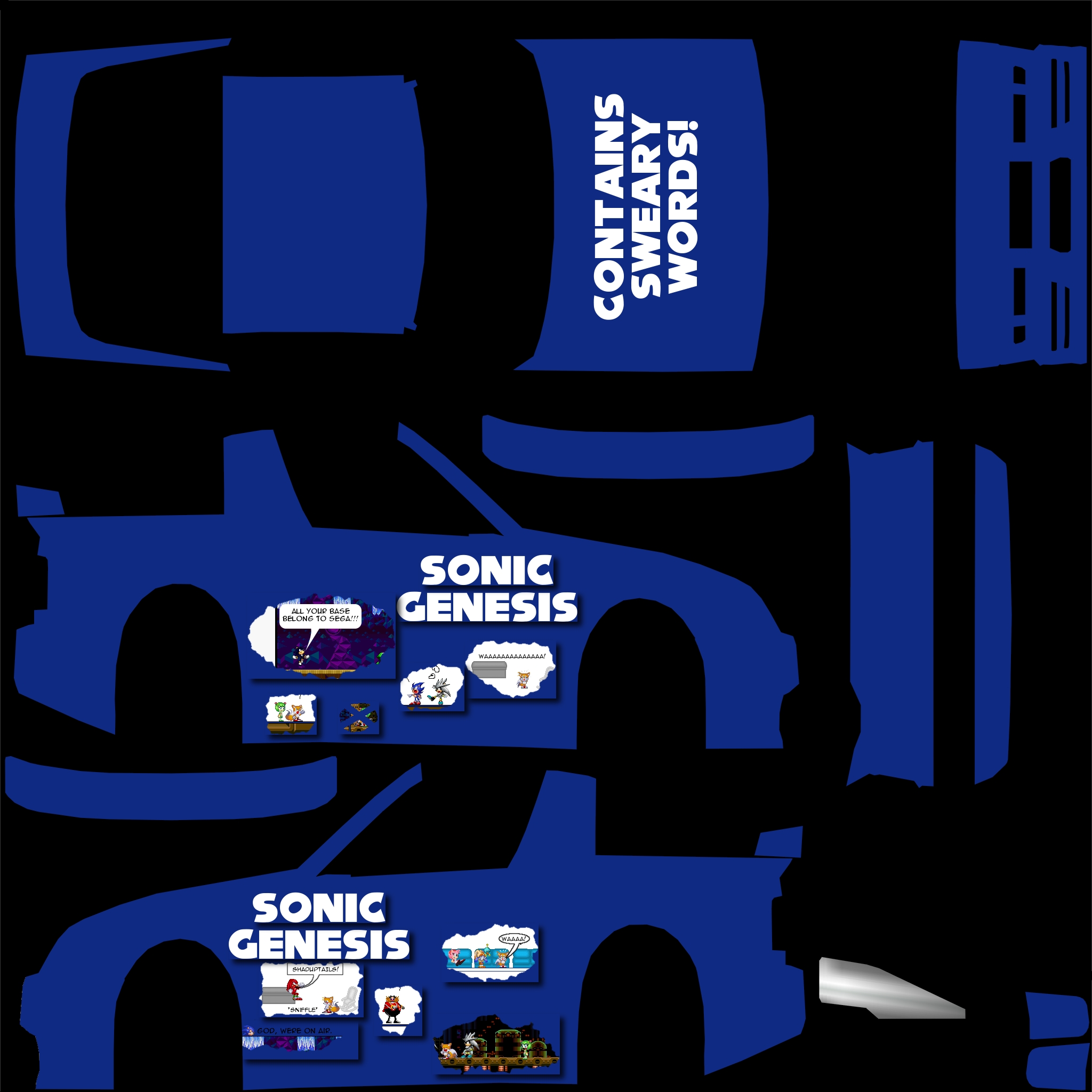 Well, meh. I would like ideas for the car i am designing for my comic series, Sonic Genesis. Instead of a shot, I am releasing the incomplete skin. I would like to see your ideas.