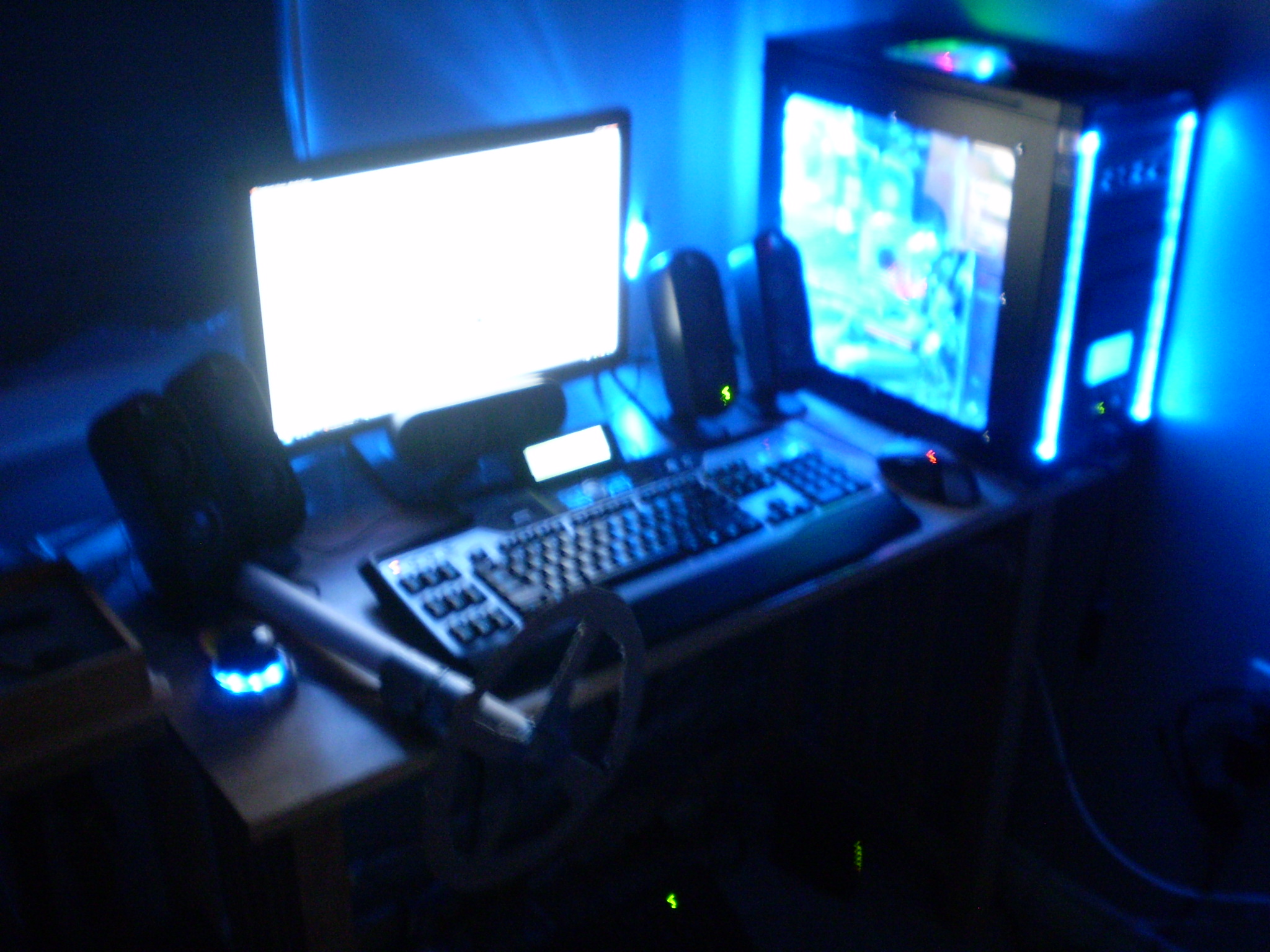 , Blue Glowy thing is 3DCONNEXION Space Navigator, then my 8lb weight to hold my homemade wheel down(Acer Mouse used). Then G15 Keyboard, X-530 speakers, G5 Mouse, Acer 19" Wide monitor, below are my Acer keyboard pedals, then my Computer on the right, with my Logitech headset bottom right.Simple as that!