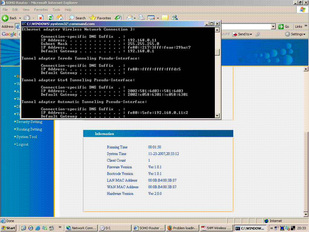 Ive installed my usb "dongle" drivers and plugged my router etc in with the Ethernet going to the "wan" port (choice of lan 1-4 or "wan") my router is a well it dosnt say anything except for model 52629 which is apparantly compliant with my belking 802.11g "dongle" once everything was plugged in everthing connected together fine (apparantly) but i apeared to have no internet acsess, i had a look at the manual for my router and went to my internal i.p/router configaration (Http://192.0.0xxx etc) it didnt load...played around a bit and got it to load followed a wizard thing to set up...still no internet...and now i cant get back to the router/ip setup page just "Page cannot be displayed with ie (teh suckzor) and unable with firefox :|" Anhyhelp would be greatly apreicieated