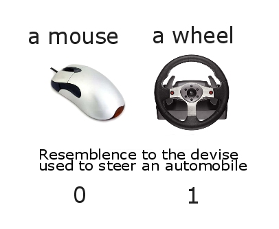 Imo, a circular thing (even a plate) is always closer to a wheel used to steer a car than a devise which has its look from a small critter. It has the same principal, which is a circle rotating around the axle. Of course, if you use a more twisted logic, you could think the mouse as a devise used to control the driver's hand or the player. With a wheel you put yourself in the position of the driver automatically.