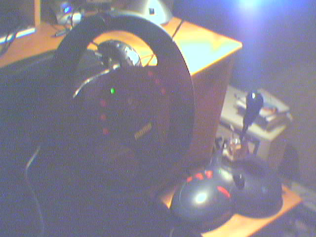 Here are a few pictures of it all set up. A few pieces of wood keep the momo knob in place and secured on the joystick base. Also, I've got a spare momo wheel here that I'm using for a clutch.