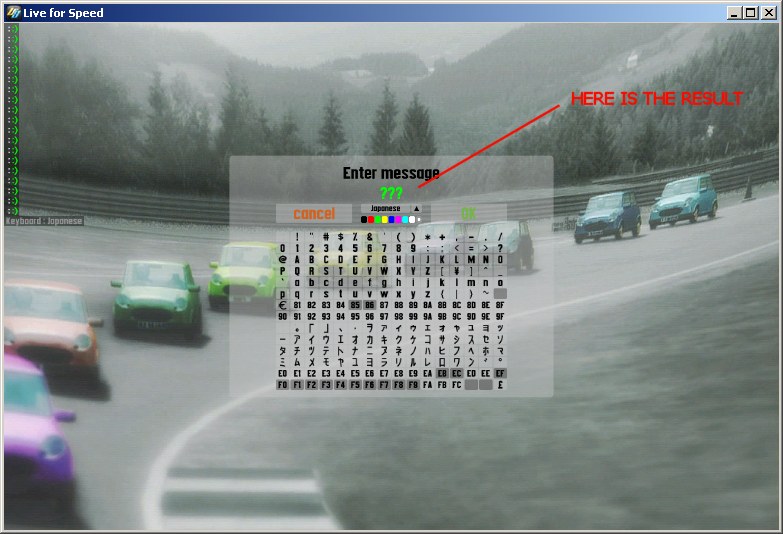 I have one problem at the moment with the Japanese input method, I can't reproduce your video 100% - if I type in "soduko" so I see three hiragana, then press enter, I just get 3 question marks in LFS "???". And if I press space to see the 2 kanji before pressing enter, then I get 2 question marks "??". I don't know why the default IME is sending question marks to LFS. Maybe there is a unicode / code page setting I can't find... LFS does know that Japanese code page is selected, I think it is really receiving question marks.