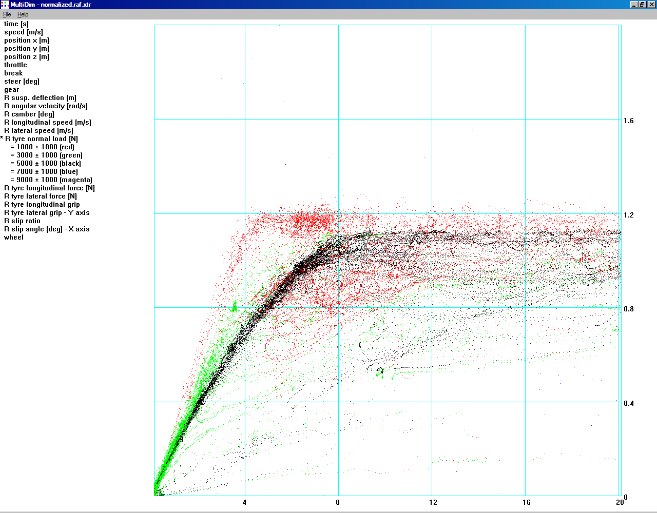 Yeah, well, uhm, okay. Did a 16 minute stint with all kinds of crazy FBM driving. Attached is first a normalized colour coded lateral grip vs. normal load graph, with the colours indicating the individual wheels (green = left front, black = right front, blue = left rear, magenta = right rear). The second graph is without normalization (with normalize I mean that an absolute value was taken for lateral grip).