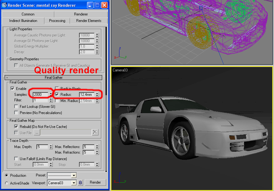 Quote from kyler :Ok here is my first mental ray render. There are a few problems the main one is the glass. 2nd one is the back ground and. 3rd one is the rims witch i plan on replacing.... =) what do i need to fix?