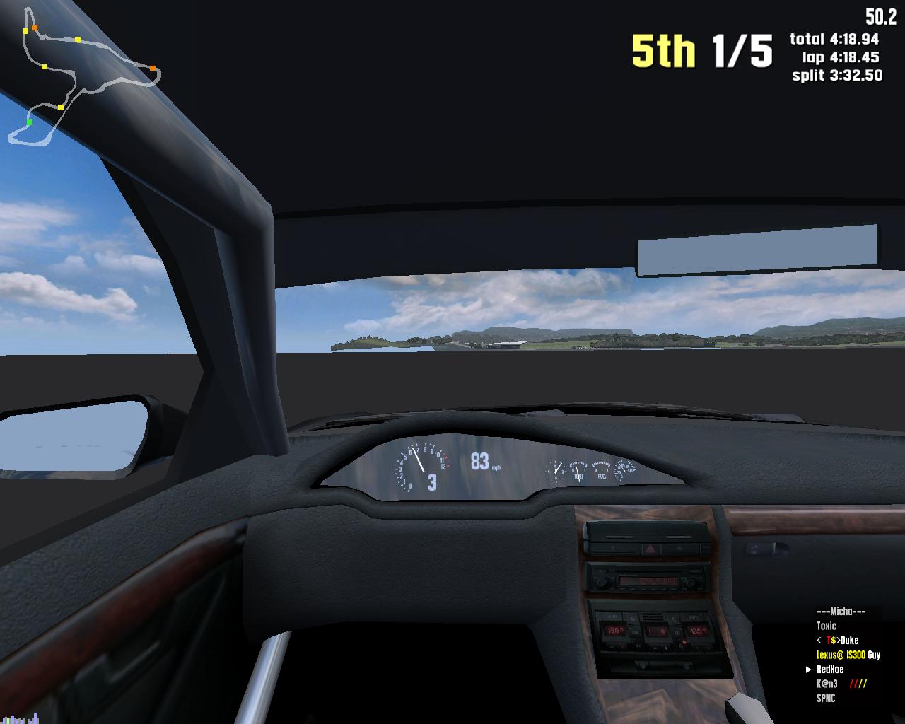 Ouch, and I thought I was bad with my connection, but at least I have 56k!! This happens to me when I try to download skins while spectating. I, of course, lag while downloading and can't see anyone's cars. But then when the current downloading skin is loaded, I get this when I start to view the cars again. Reconnecting to the server or just going back onto the track from pit garage/spectator reloads the textures. I've ONLY ever seen it when downloading the skins on my dialup as it takes several minutes just for 1 skin.