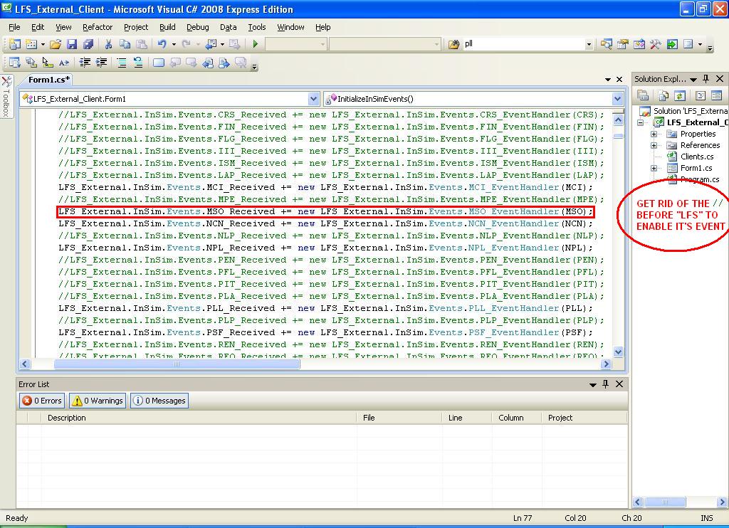 after when i finished doin somthing with the inSim in C# 2008 i pressed F6 and it said build succeded so that was good... But when i went into LFS_External_Client/Bin/Release and i clicked on the Exe when it had connected to my server i went on it but when i typed in !help Nothing happend... No commands showed up at all it did say it back to me just accepted it but it wouldnt give me the commands. Thanks please help