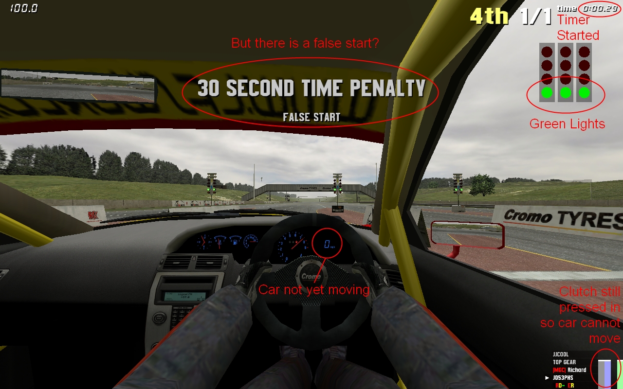 Lights went green (and race timer started) > Got a 30 second time penalty > My car starts moving