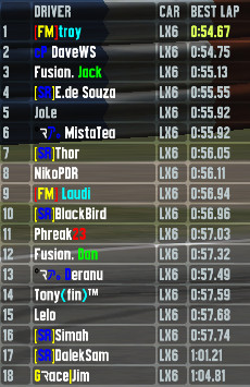 Qualify: Two drivers were knocked at the qualifying, [SR]DalekSam and Grace|Jim. But Simah disappeared so Dalek took his place on the races. [FM]troy, with an amazing lap, got his second pole position with cP DaveWS following him closely and Fusion. Jack in third place.