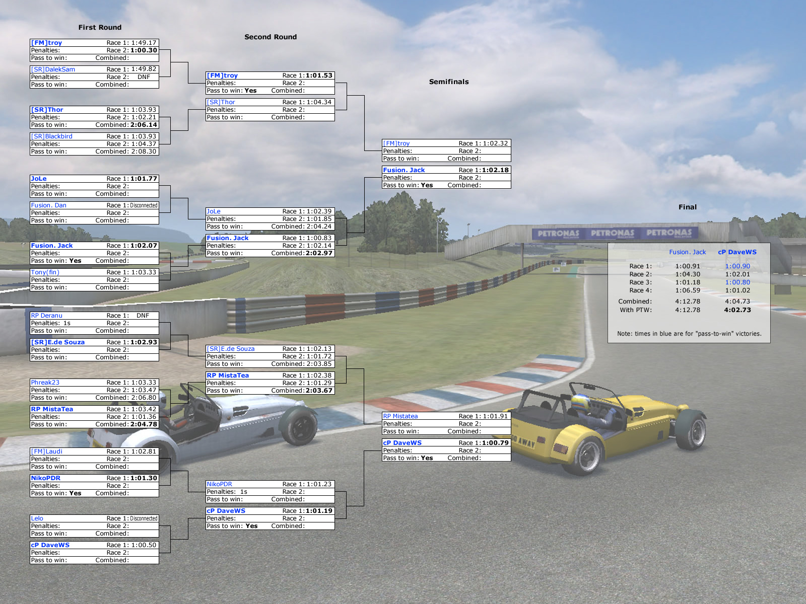 Semifinals: Fusion. Jack was quick on the inside of first corner when [FM]troy stepped on the grass and went wide. Troy tried his best, but Jack was confident and crossed the line 0.14s ahead. On the other semifinal, this time RP. MistaTea had to deal with the pressure as cP DaveWS was following him very closely, and a mistake on the chicane exit costed him the place on the finals, as Dave won with a PTW.
