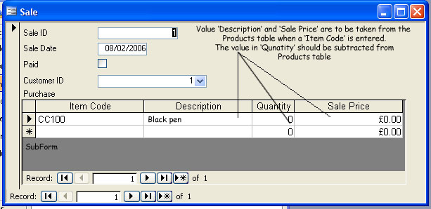 Microsoft Access has been driving me mad ever since I started my Advanced Higher Information Systems course work. Basically I'm building a stock control database which records the sales but picks up the description and sale price when a 'Item Code' has been been entered.