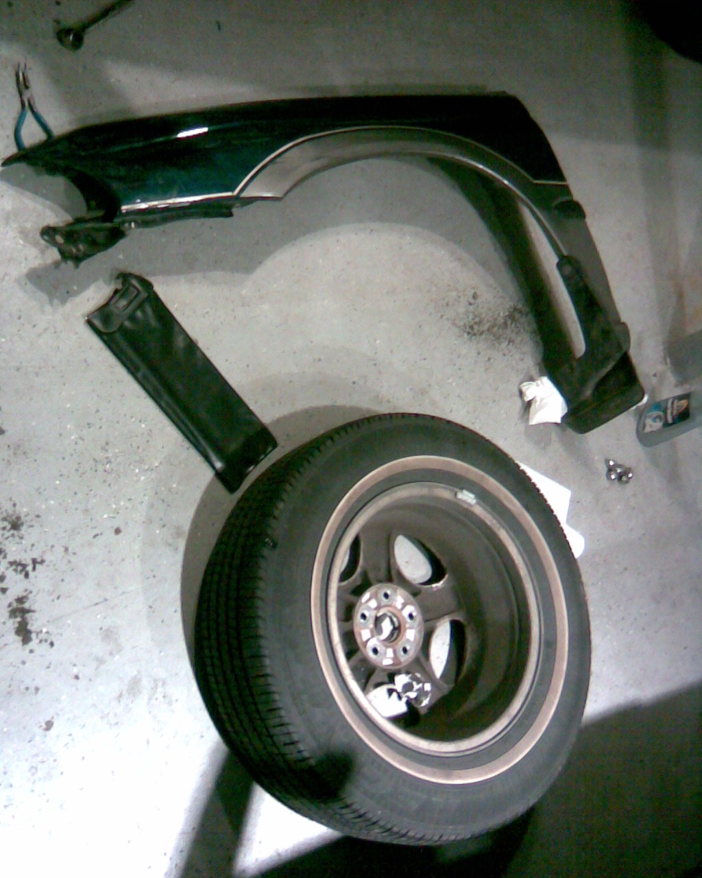 Never done anything other than change the tire before, lol. Need to replace the turn signal indicator lens/assembly - replace or hammer out the left fender, and later the driver's side mirror (which is taped up.) Maybe one day I'll repaint the bumper too.