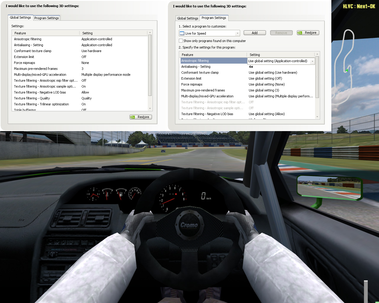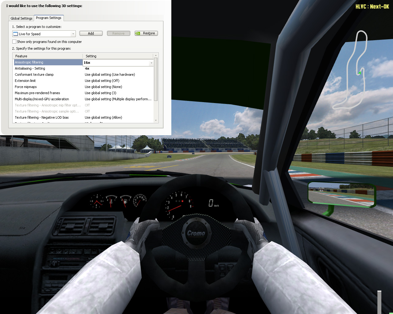 So anyway, I set it back to "let the 3D application decide" which works fine for games that have their own AA/AF settings (which is to say, most of them except LFS).