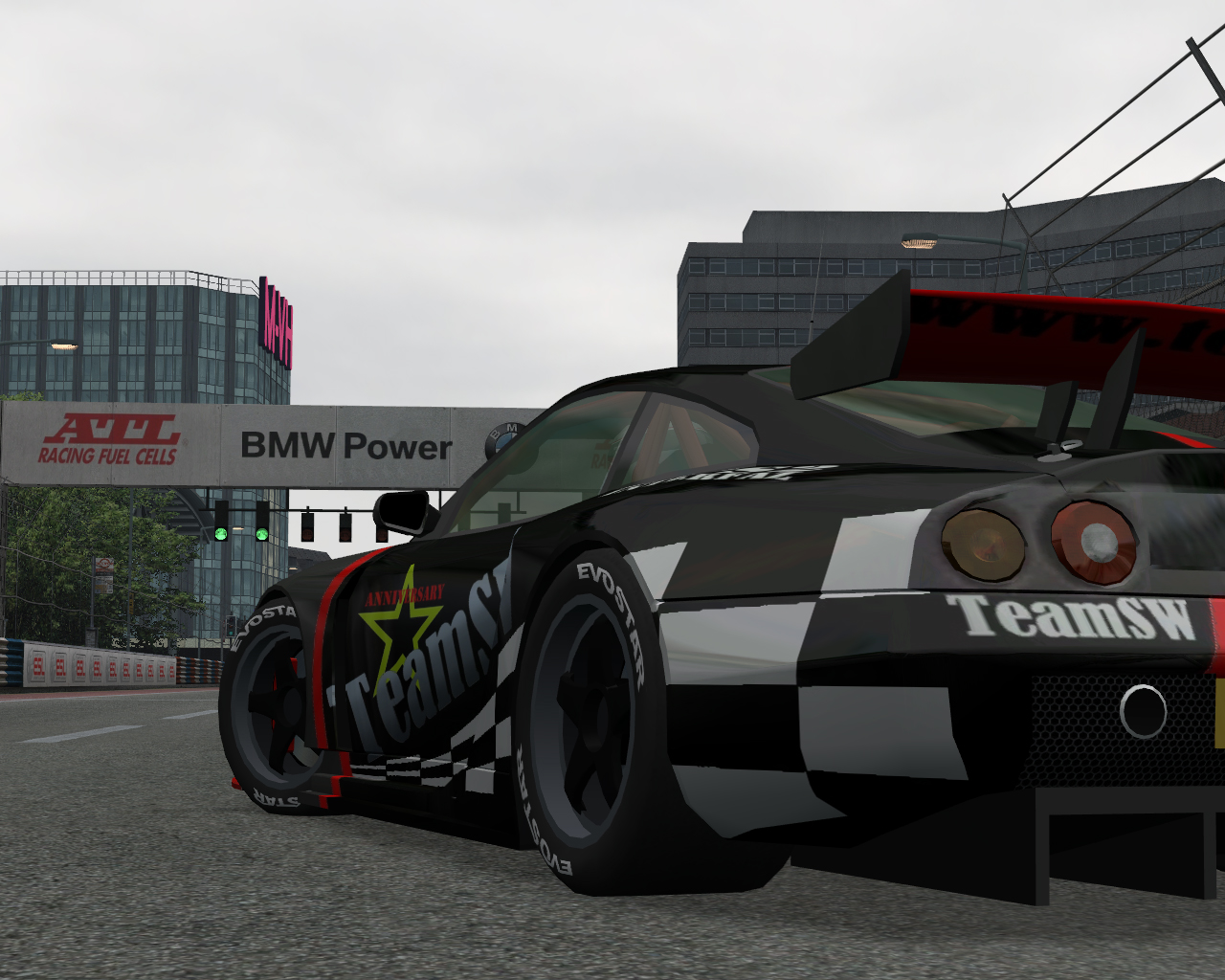 1st of all the skin on the car is low quality. The checkered flag on the back of the car is full of jaggies. Then there are the reflections, there are so many of them that I can't even see the car, which judging by the composition of the shot seems to be the main focus. It blends together with everything. There is a time and place for reflections, this just isn't one of them.