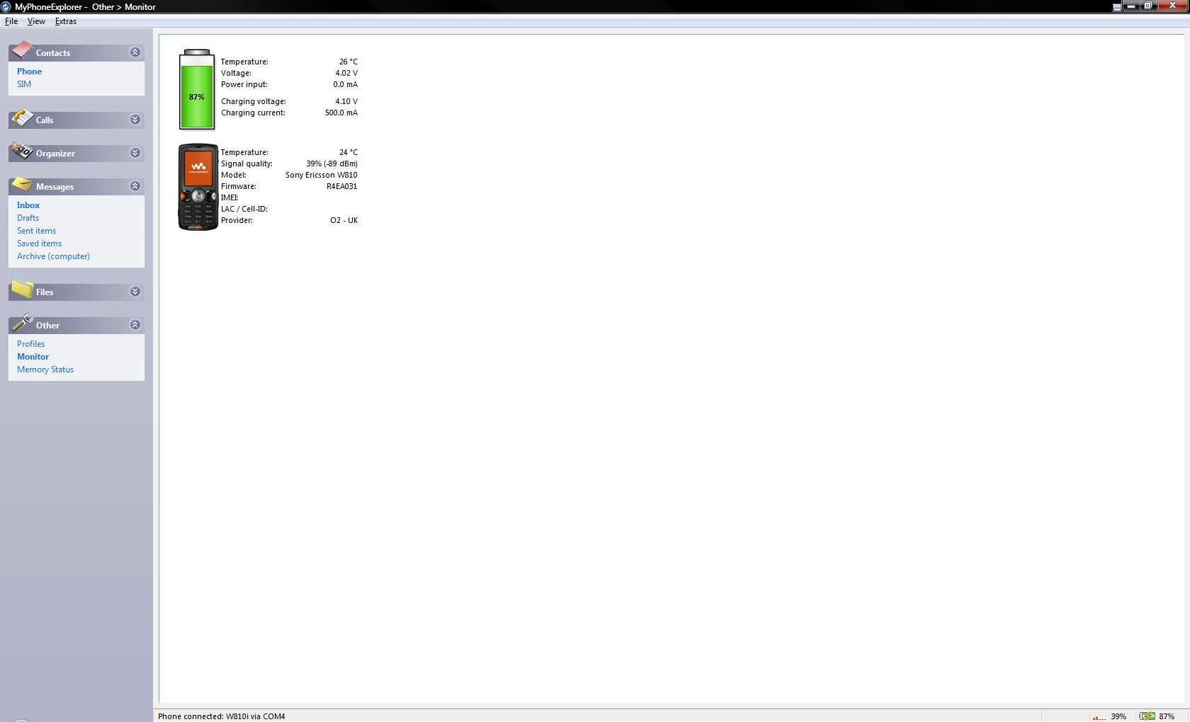 Ok, after I found an AMAZING bit of software for any Sony Ericsson phone (MyPhoneExplorer), and when I plugged my W810i it gave me the screenshot attached.