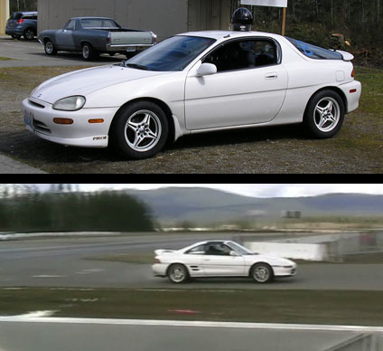 Bremerton raceway is basically the old unused runway at the Bremerton Airport. The track is set up with cones or tires, like autocross. Only it's bigger, faster, and has a main straight. Pretty good for testing and tweaking the car and getting some practice in before going to Pacific Raceways. It's a lot safer, too. It's flat and wide. There's nothing around but grass. Only things people hit are cones. Those cones, they bounce around when hit, and they rarely get reset, which adds variety, since if someone hits a cone or two, next time you're coming around the track the layout is different, heh. At some point they got so scattered that I couldn't figure out where to go... Kind of make your own course type deal.