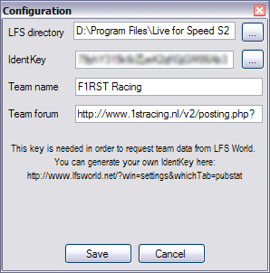 Please note that for the last option an LFS World IdentKey is necessary, since the team data is retrieved from the LFS World Team database. You can generate an IdentKey here. If you leave the team name field empty, no drivers will be emphasised.