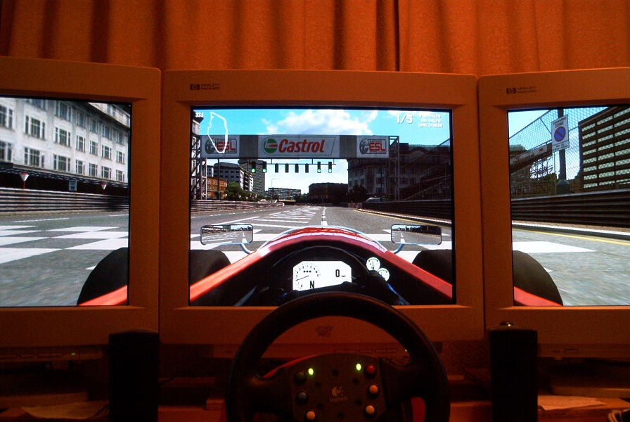 Right - you need 3 19 inch tft monitors for the 3 screen view. THen 2 little 9 inch screens for wing mirrors. THen a 12 inch widescreen sittinon on top of your monitors for rear view mirror. Would be amazing lol. Although i have no idea how possible it would be. lol.