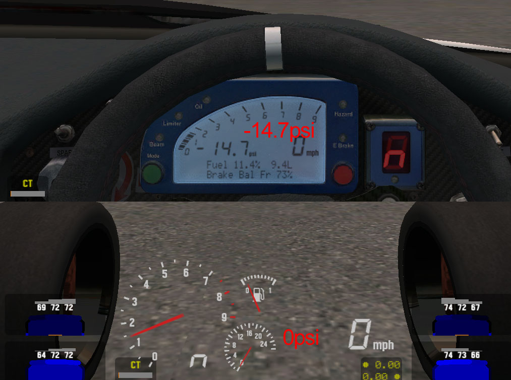 Yea the analog turbo gauges in LFS never did show turbo vacuum like real-life gauges do, the lowest indication being 0 PSI. Good eye though, I didn't even see that.