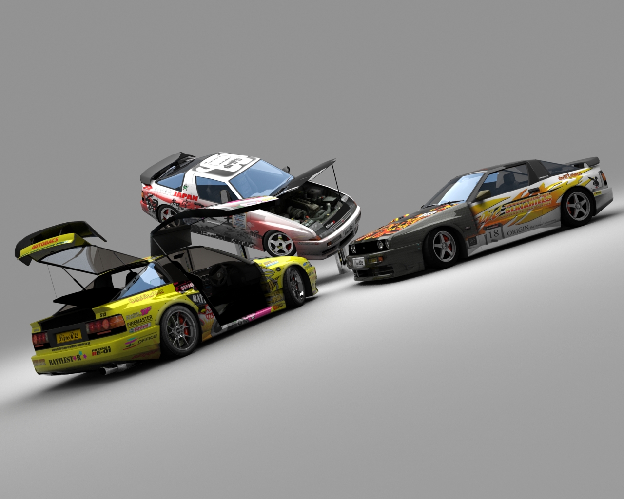 FBM - Should be placed in front of those cars, kind of in the middle between them, but sideways, so FBM side should be facing the audience.