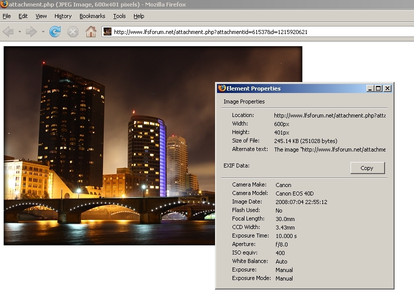 I use Opanda Exif viewer. What is the plug in for that one? I want! I assume that was right clicking and selecting properties. If I use properties in FF, all I get is the typical file name, file size, and dimensional size.