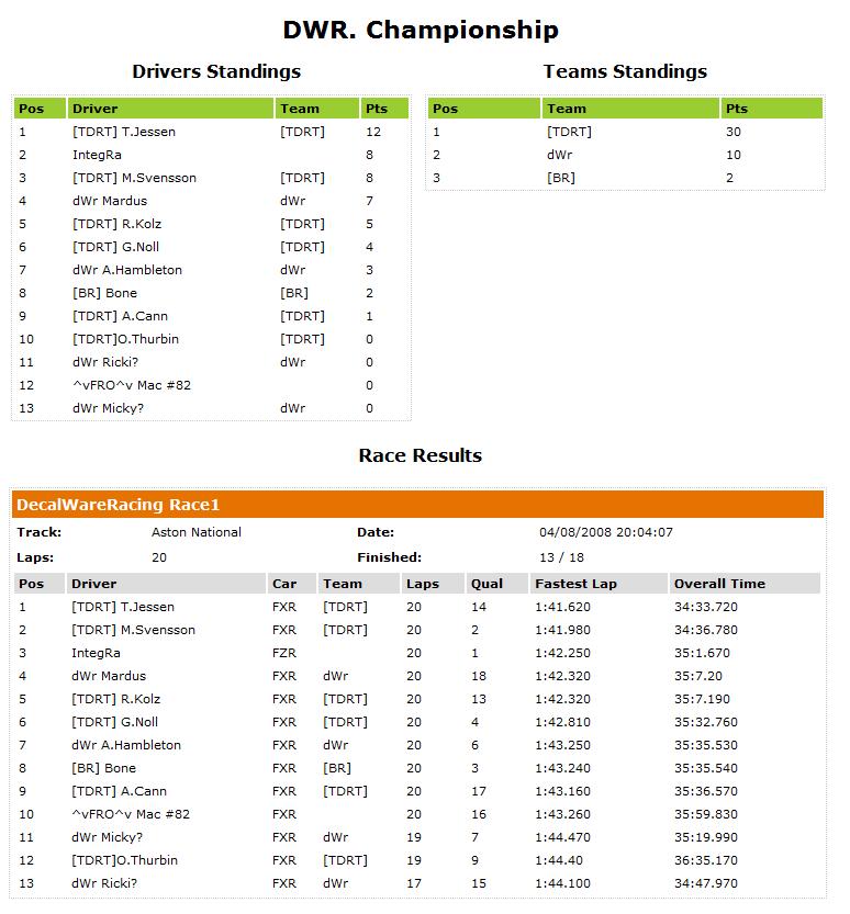 The 2 Race was cleaner and startet whit no restarts but in this round i spun out in the first corner tnx to DwR moper or whats his name is (You are forgiven by the way