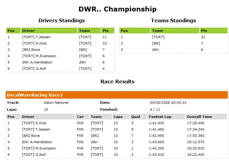 The 2 Race was cleaner and startet whit no restarts but in this round i spun out in the first corner tnx to DwR moper or whats his name is (You are forgiven by the way